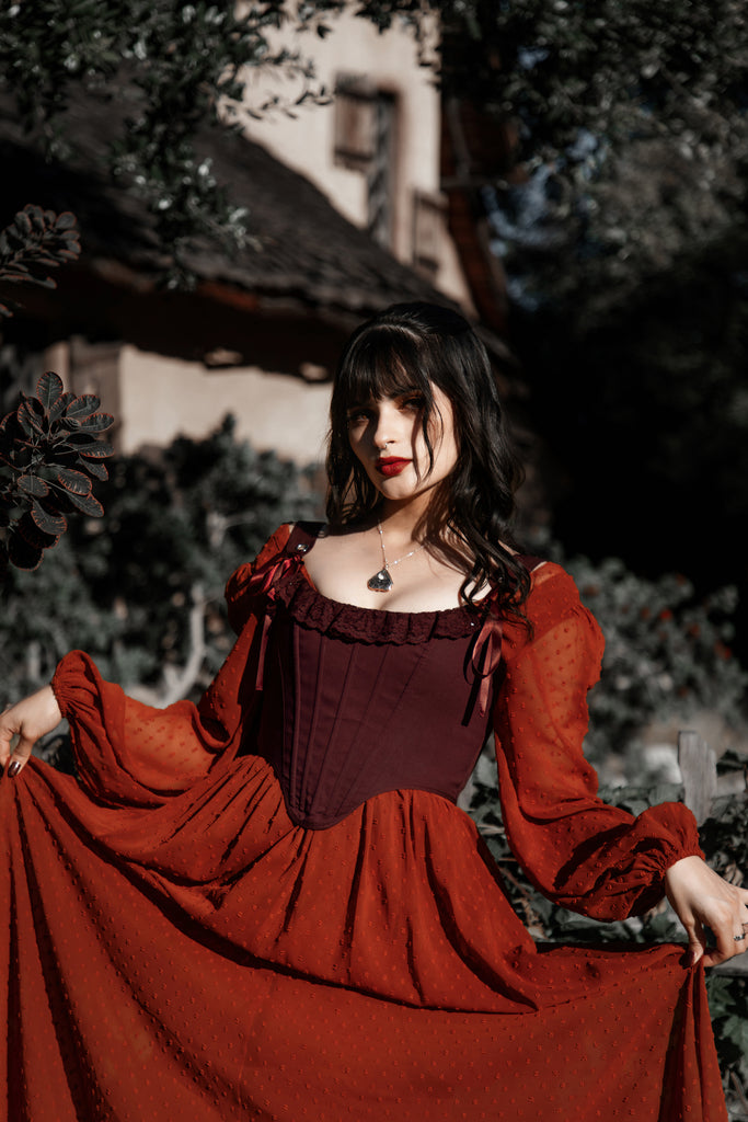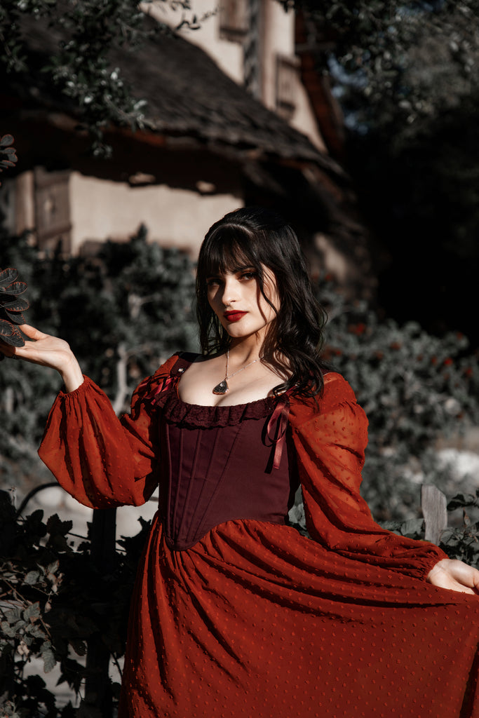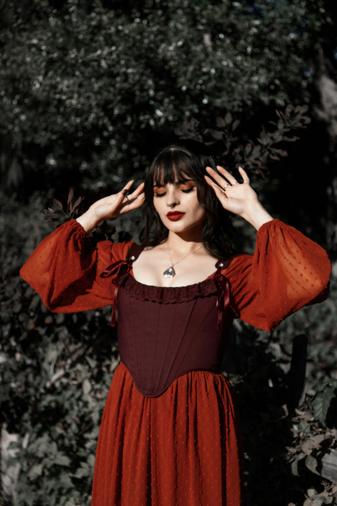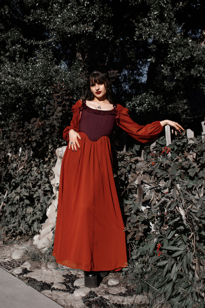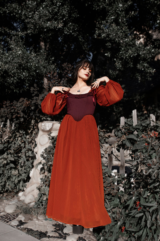 • Style + Features : Ruched bodice with cutaway detailing, hidden pockets on either side, balloon sleeves