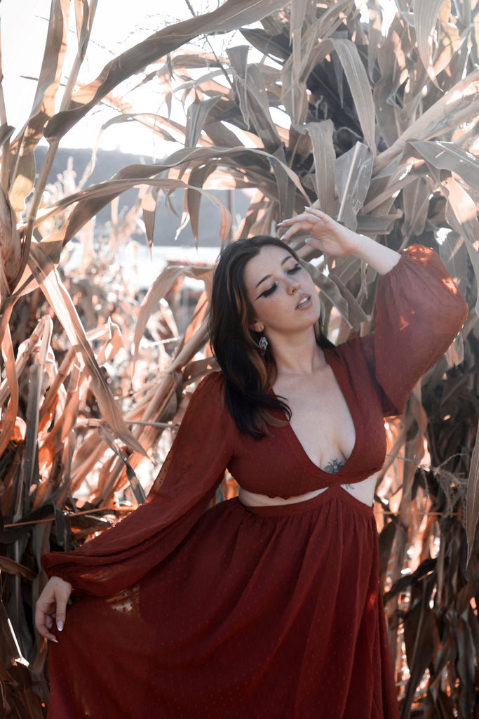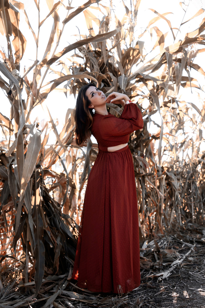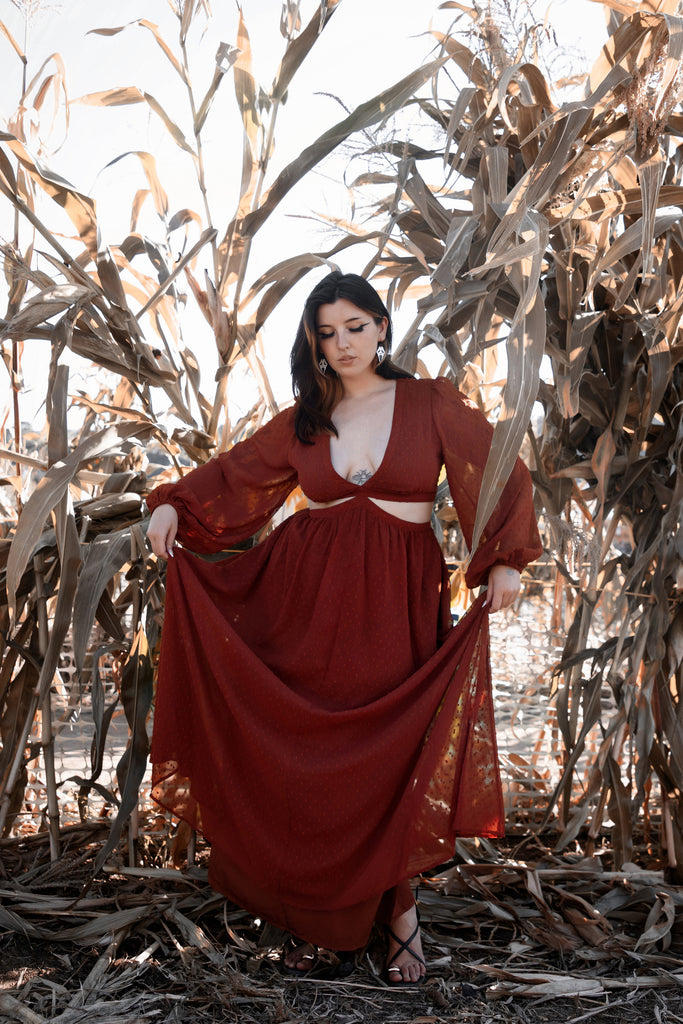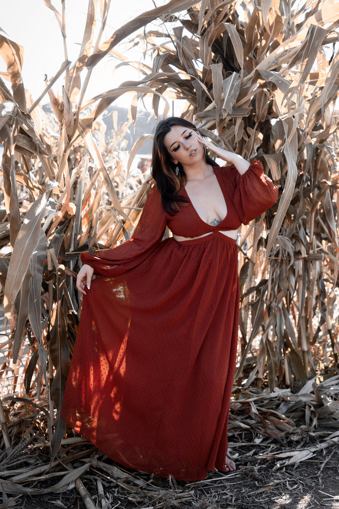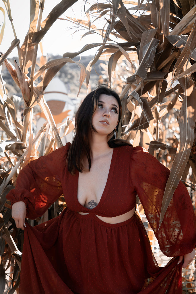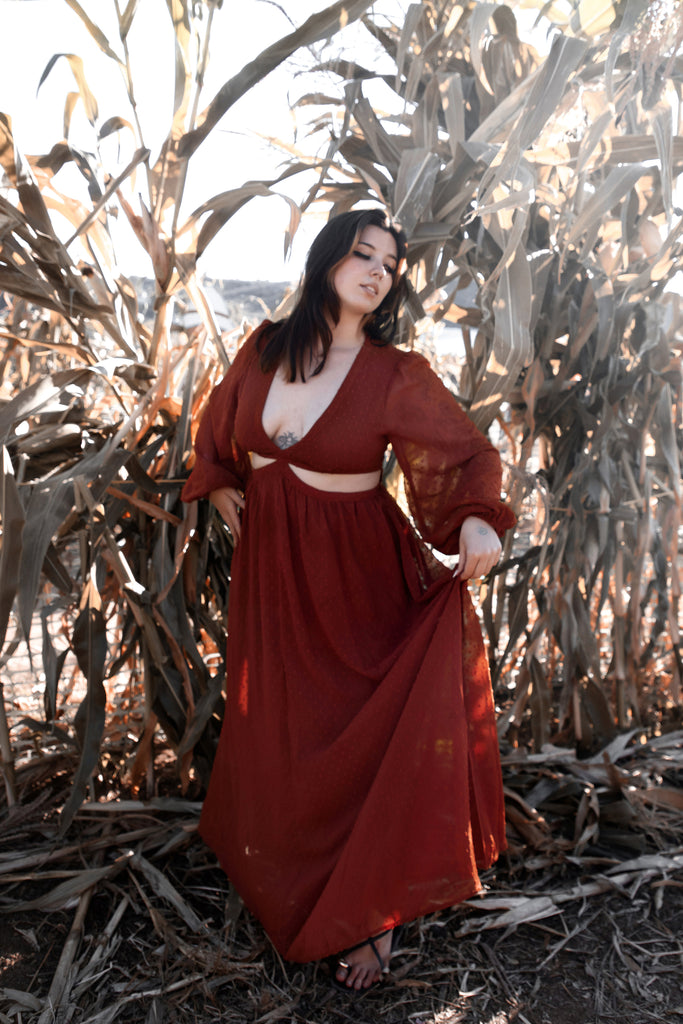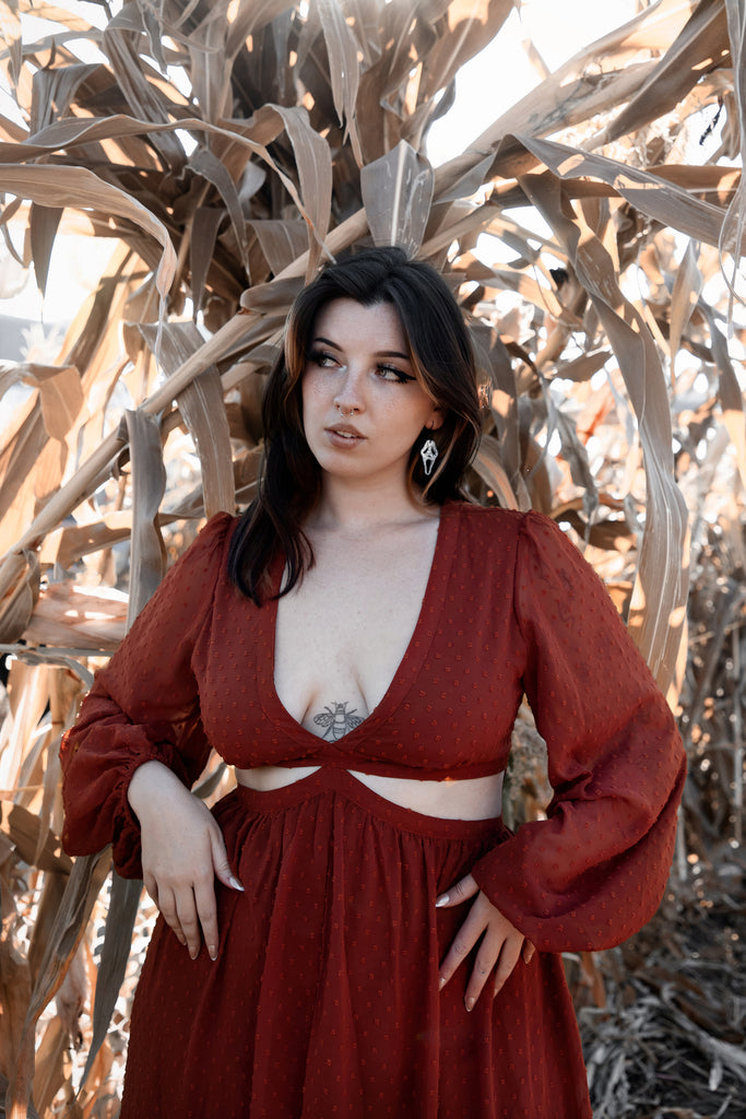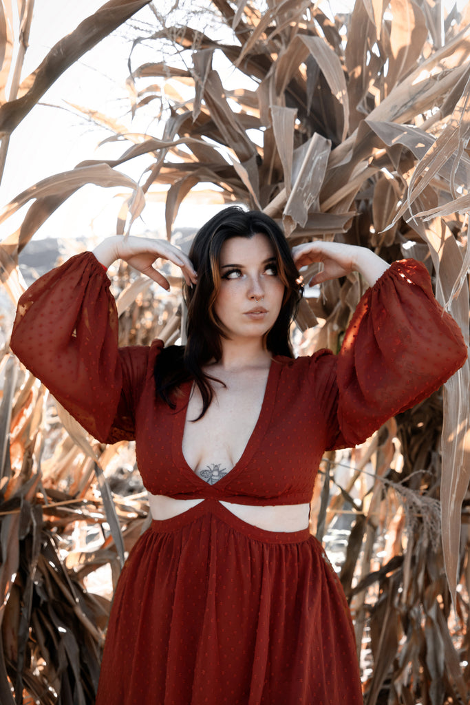 • Style + Features : Ruched bodice with cutaway detailing, hidden pockets on either side, balloon sleeves