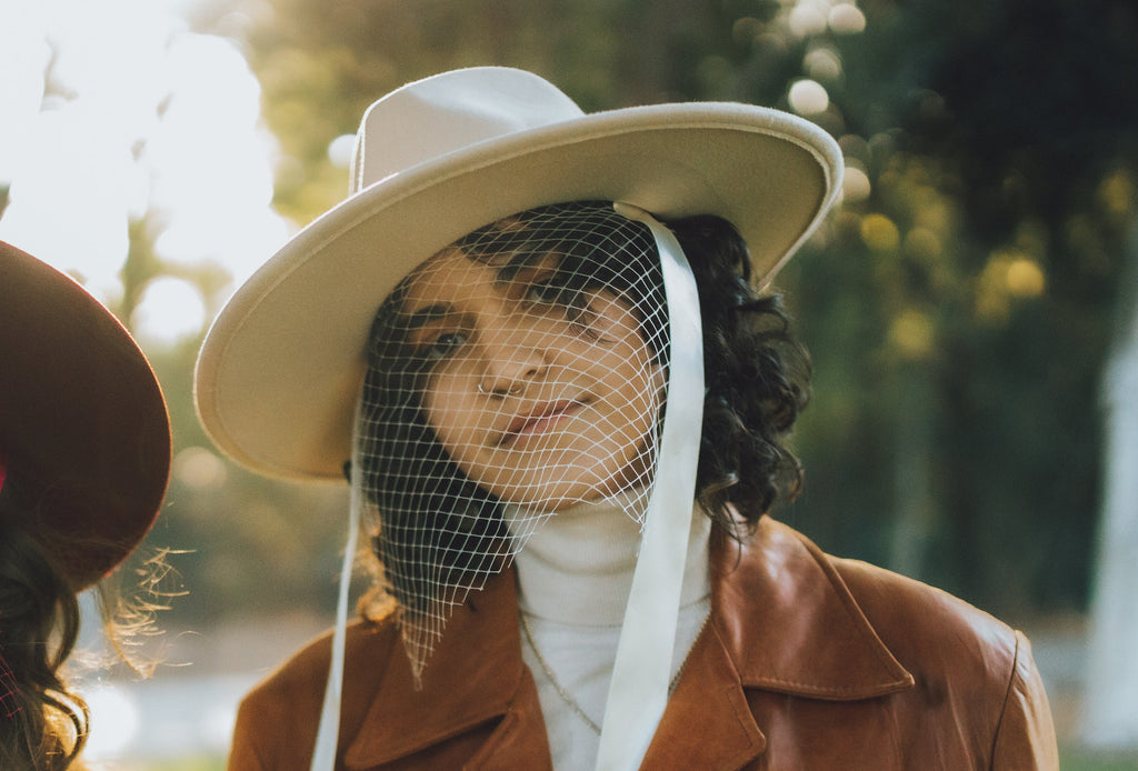 Vegan friendly, this wool-alternative-based hat features ribbon closures and a delicate veil front piece.